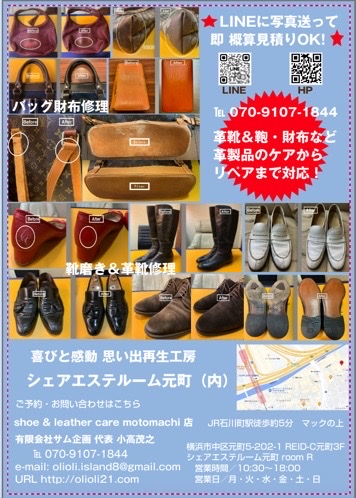 靴磨き革靴再生バッグ修理ブランドバッグ買取 チラシ配布 横浜元町