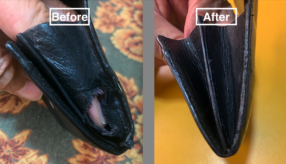 この小銭入れは思い入れがあるため、新しい物に買い替えるのではなく、できるだけ元の状態に戻したいというご要望がありました。そこで、傷んだ部分だけを部分的に革を張り替え、他の箇所と馴染むように慎重に仕上げていきました。