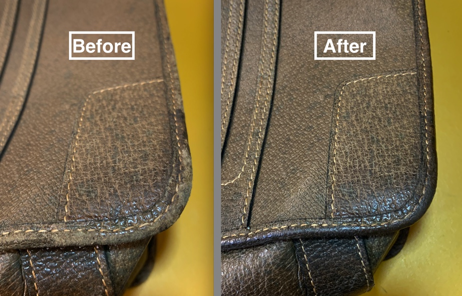 - 擦り減って薄くなってしまった四隅の部分には、色補正とレザー専用の修復剤を使用し、革の色味と質感を復元。