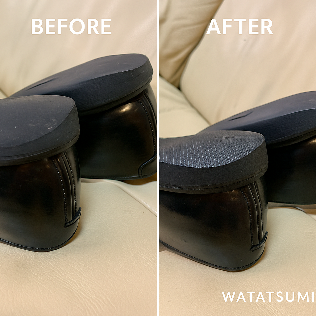 新しいヒールパーツを取り付け、接地面をきれいに整えました。グリップ力が向上し、見た目も新品同様に。