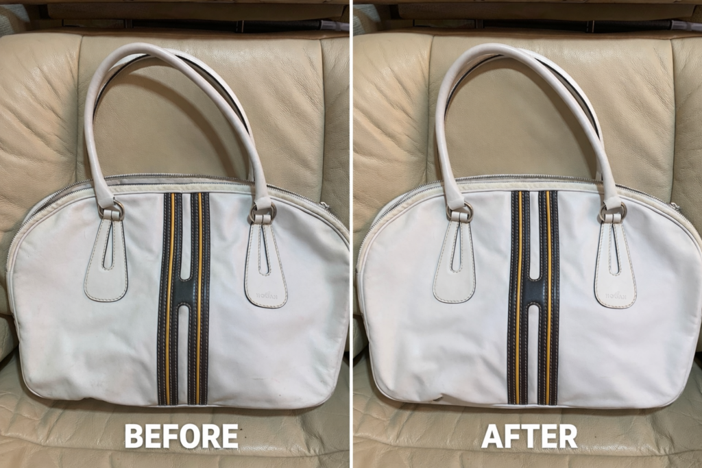 長年大切に使われてきた白いレザーバッグ。
