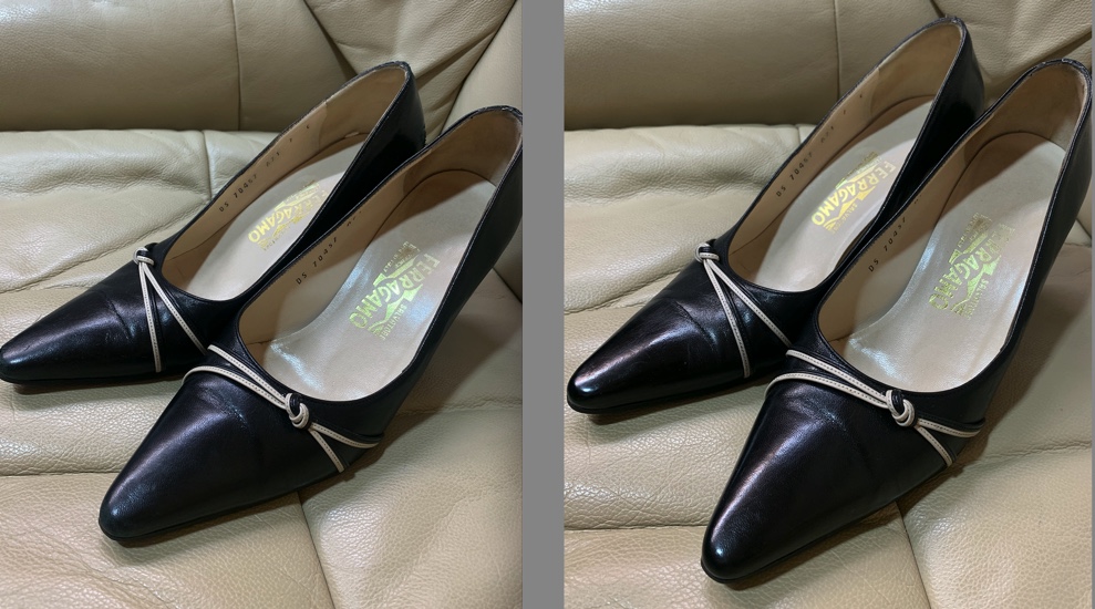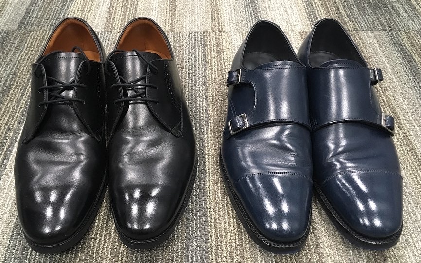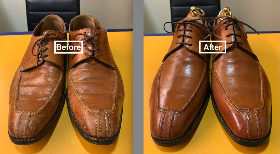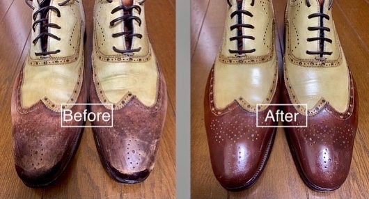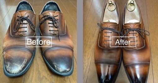ベーシックコースの後 つま先と踵に高級カルナバワックスと蜜ロウ(ビーズワックス)の高級靴クリームにて磨き上げ 深みのある上質なハイグロス(光沢)や風合いを演出し 同時に優れた保革効果を与えます