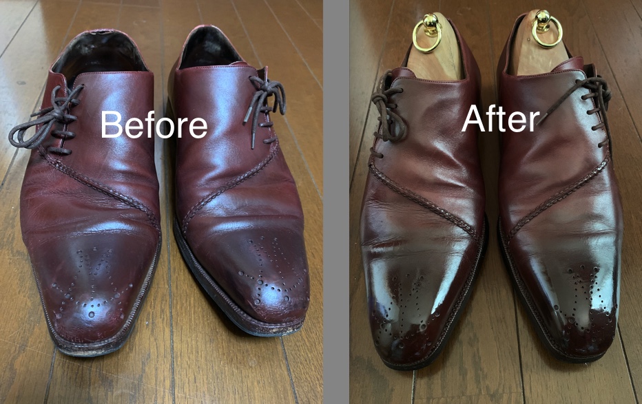 ベーシックコースの後 つま先と踵に高級カルナバワックスと蜜ロウ(ビーズワックス)の高級靴クリームにて磨き上げ 深みのある上質なハイグロス(光沢)や風合いを演出し 同時に優れた保革効果を与えます